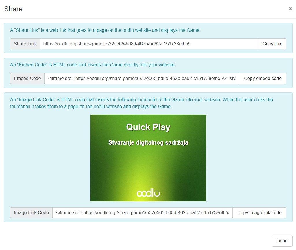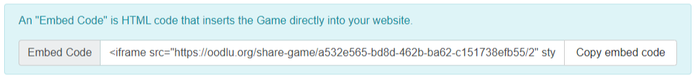 Mogućnost Embed Code biramo kako bismo Oodlu kviz ugradili u svoju web stranicu, odnosno stranicu škole.