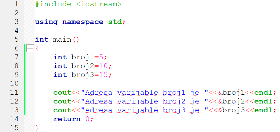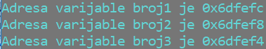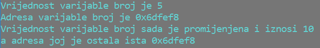 1. primjer: Provjerimo adrese varijabli u memoriji