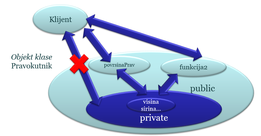 Funkcije objekta mogu pristupati svim članskim varijablama i funkcijama. Klijenti mogu vidjeti samo javne članske varijable i funkcije.