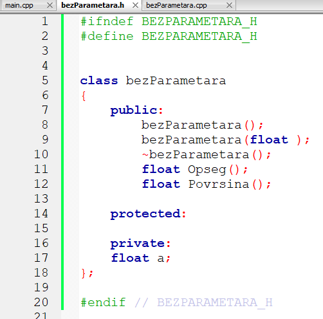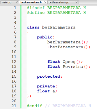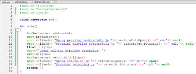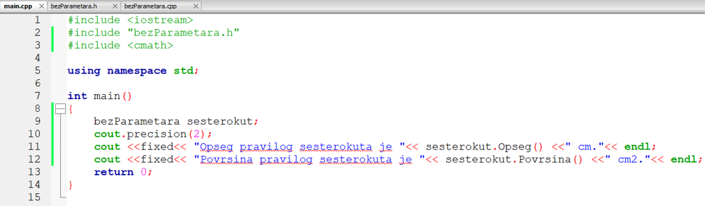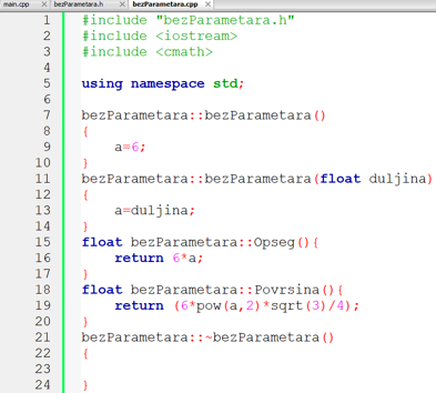 1. primjer: Napišite C++ program s deklaracijom klase bezParametara. Klasa treba imati jednu člansku varijablu (duljinu stranice pravilnog šesterokuta) čiju vrijednost treba inicijalizirati putem konstruktora klase, te dvije funkcije bez parametara od kojih jedna računa opseg, a druga površinu pravilnog šesterokta. U mainu treba: